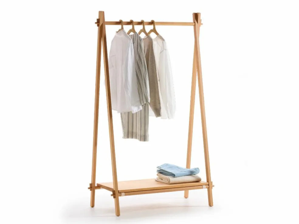 Die Bauteile werden von genial einfachen, im Prinzip uralten, bei Bedarf wieder lösbaren Zapfen & Keil-Steckverbindungen sowie reißfesten Baumwollgurten fest zusammengehalten. Der Kleiderständer kann ohne Qualitäts- und Funktionsverlust wiederholt montiert und zerlegt werden, etwa bei einem Wohnungswechsel.