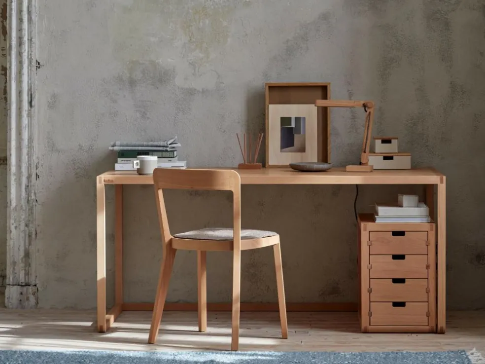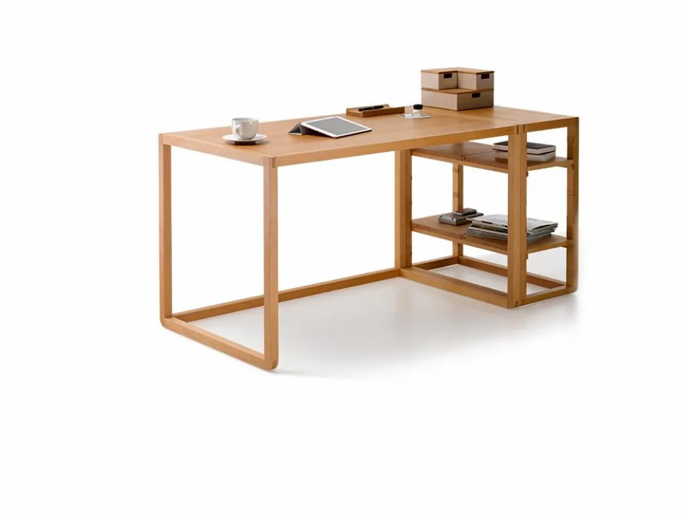 Moderne Ästhetik, das Naturmaterial Holz und eine verblüffend einfache Funktionalität: Das ist die Quintessenz eines Schreibtisches! Die auf ein Minimum beschränkte Formensprache reduziert dieses zeitgemäß schlichte, optisch leichte, technisch transparente Home Office Möbel auf das Wesentliche, lässt daher viel Raum für kreative Gedanken und – ebenso anstrengende – gedankenfreie Muße.