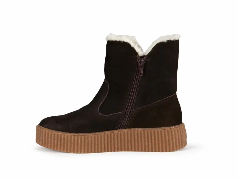 Stiefelette aus pflanzlich gegerbtem und chromfreiem Leder aus Deutschland. Der Schuh aus weichem Nubukleder wird mit wärmendem Wollfutter und einem markanten, hohen Absatz abgerundet. Die leichte TR-Laufsohle (thermoplastic rubber) sorgt für ein angenehmes Gefühl und einen guten Stand, der seitliche Reißverschluss erleichtert den Einstieg.