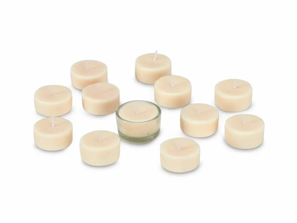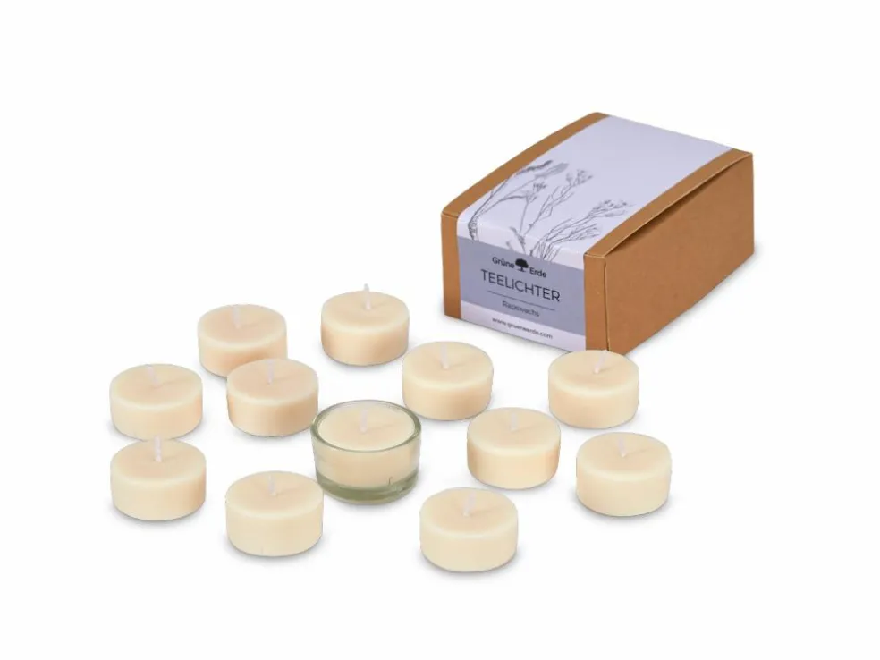 12 Teelichter aus Rapswachs, ohne Duft, 1 Glaseinsatz