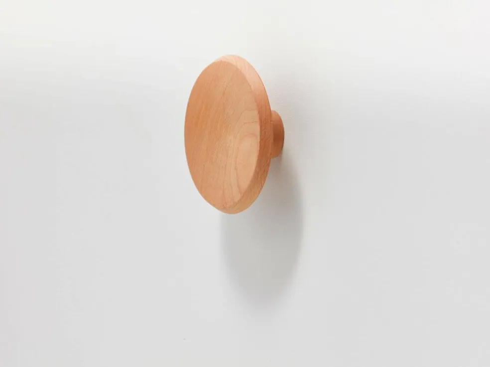 Auf den Punkt gebrachte, witzig-orginelle, einfache Lösung für Hüte, Taschen, Mäntel, Jacken, Schirme und – aufgrund des „Halses“ der Knöpfe – auch Kleiderbügel. Elegante, moderne Form mit nach innen gewölbtem „Hut“; Massivholz aus Europa, attraktive Holzmaserung, in einem Tiroler Betrieb sorgfältig für uns gedrechselt, naturgeölt.